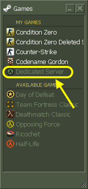 It is highly recommended that you run your HLDS server on a dedicated (separated) computer so that your players won't lag when you play Steam or use Microsoft Word. So to run a server on a dedicated computer you would use the standalone version of HLDS and to run your server and play on the same computer you would use the Steam integrated HLDS. Let's see how to install each version of HLDS: Steam Integrated HLDS: In your Steam "Games" window, double-click on "Dedicated Server".