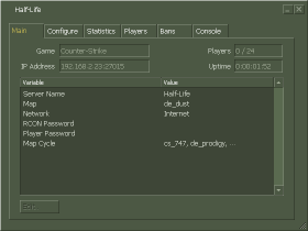 Starting Up HLDSNow that you have HLDS and have learned some basics about it in the last section, it's time to start the real fun! This section is all about starting up and running HLDS. Starting it up How to start up HLDS? The question isn't how to start it, but what technique to use to do this. That's because there are two modes that HLDS can use to run: GUI and Console. Let's compare them both: | GUI Advantages: Easy to start (no dealing with parameters) Graph statistics about players, FPS (this is not Frames Per Second!), ping and CPU usage Easy to manage CVARs and to configure the server